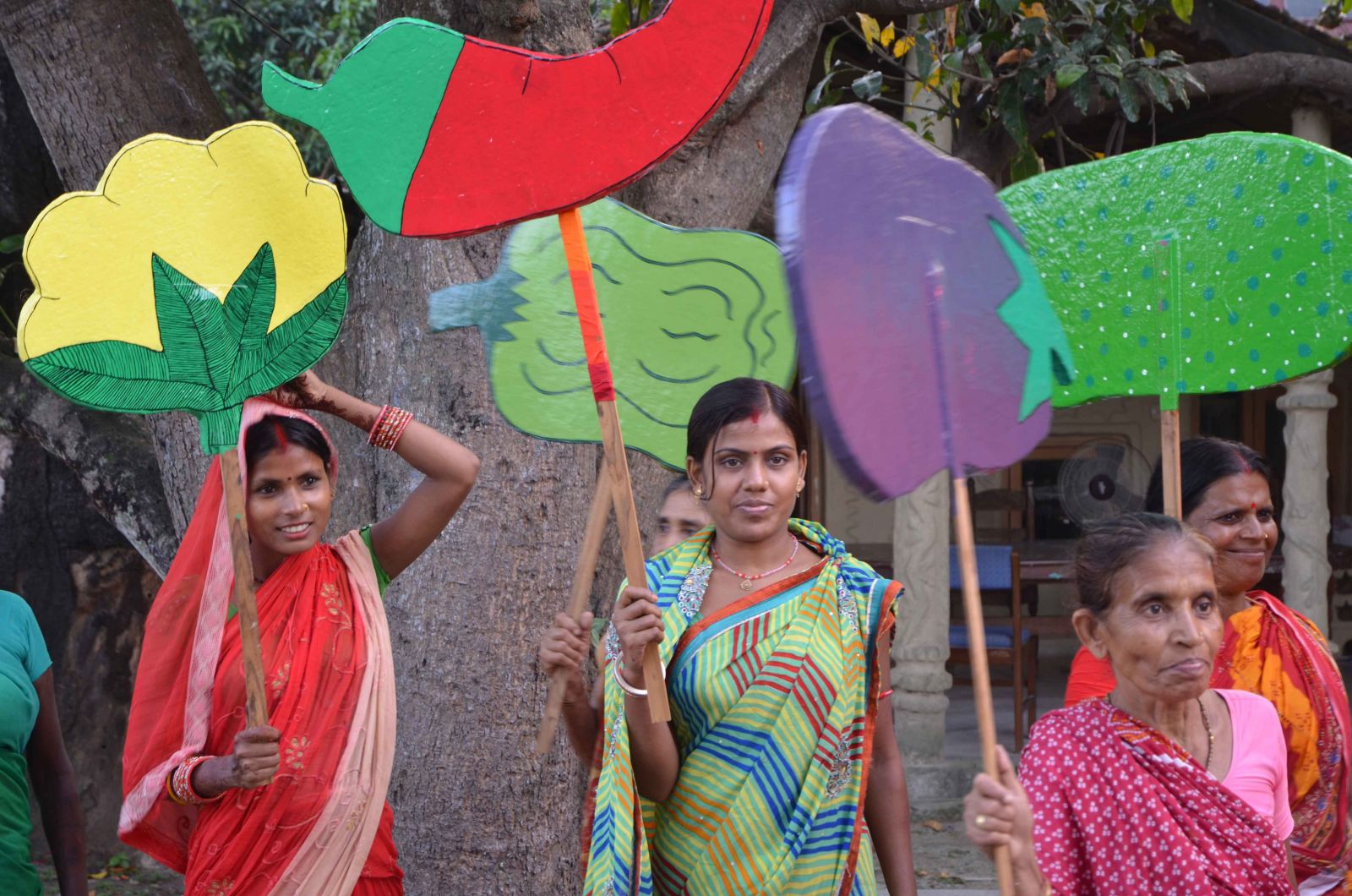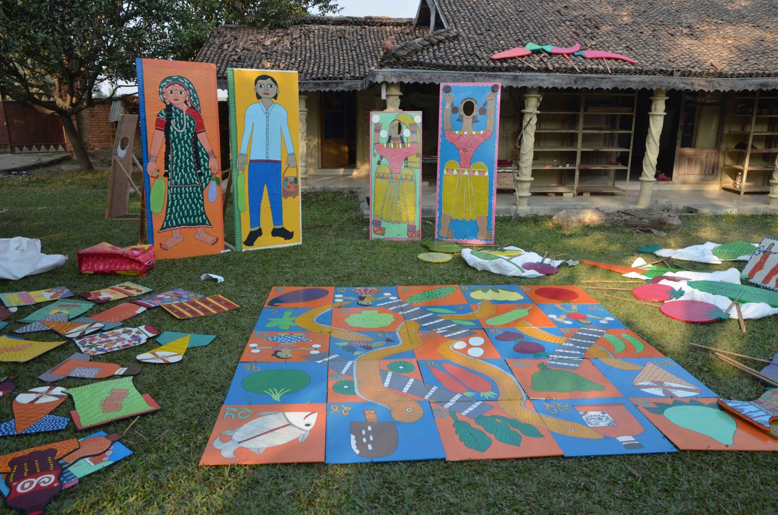 When the two intense days of the mela end, games and props head back to the Center for storage. Yet, it is not all over. The artists will continue to share their knowledge with their communities, and the drama will be performed in new venues. But now, they get busy, newly inspired for their artwork. They are painting vegetables on buckets and trays, printing vegetable table covers, embroidering vegetable ornaments, creating paintings showing exercise, and making more dumbbells, as there is suddenly a big demand. Art inspired by good health: who would not want to be surrounded by it?