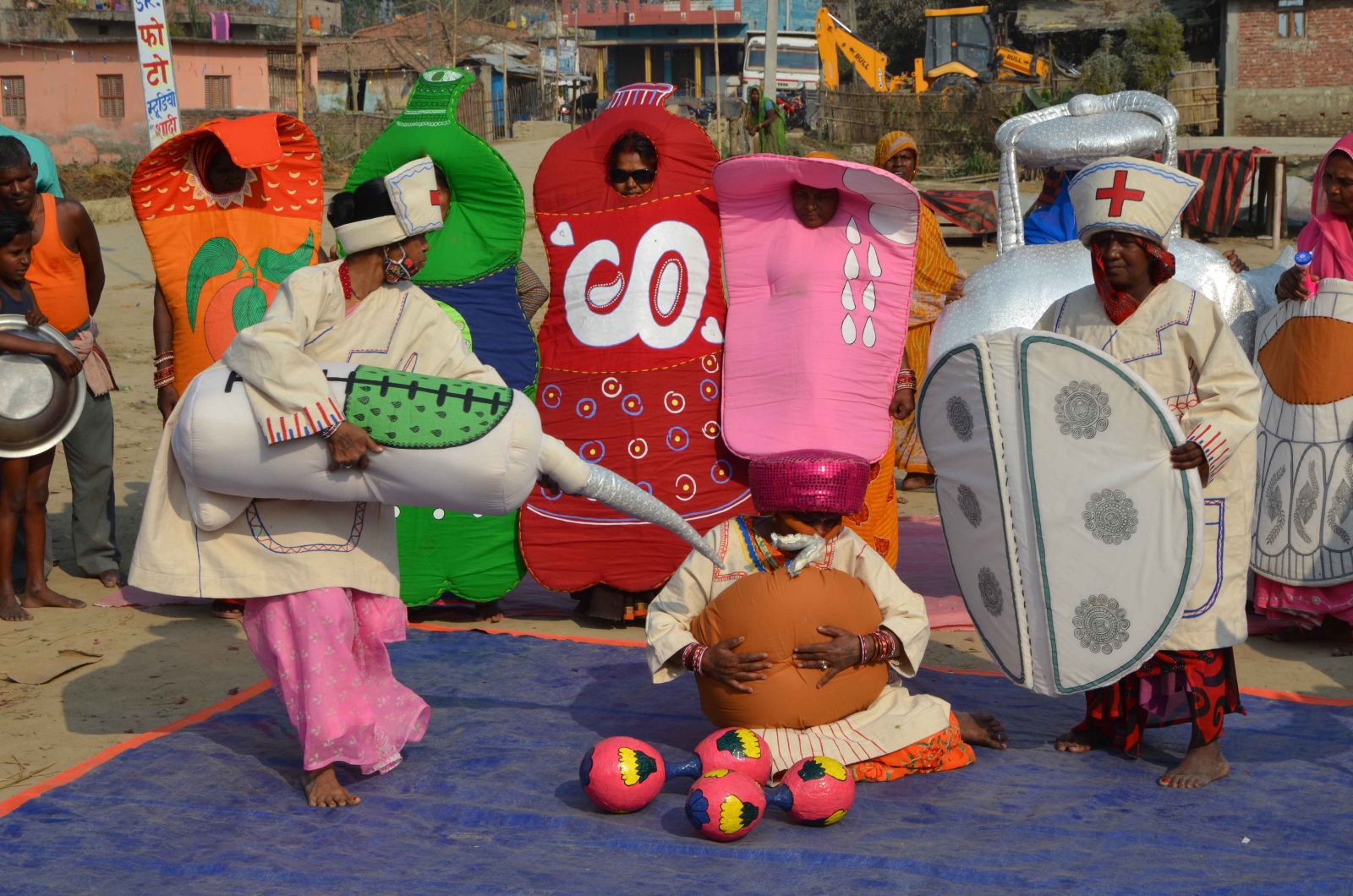 Artist Madhumala plays a man wearing a Maithil paag (the pink headdress worn by Maithil Brahmin men in weddings) and a costume of a vest and dhoti that she painted herself. She strolls onto the stage and is greeted by cheerful giant vegetables. The vegetables, including tomatoes, beetroot, cucumber, radish, and eggplant, are painted meticulously and held on sticks by the actors. Amongst them stands Sulekha, a tall woman dressed as a carrot, its intricate green leaves painted by Indrakala. The vegetables are thrilled by the attention from the man, and quickly dismayed when his attention is diverted by a nefarious gang of unhealthy foods.