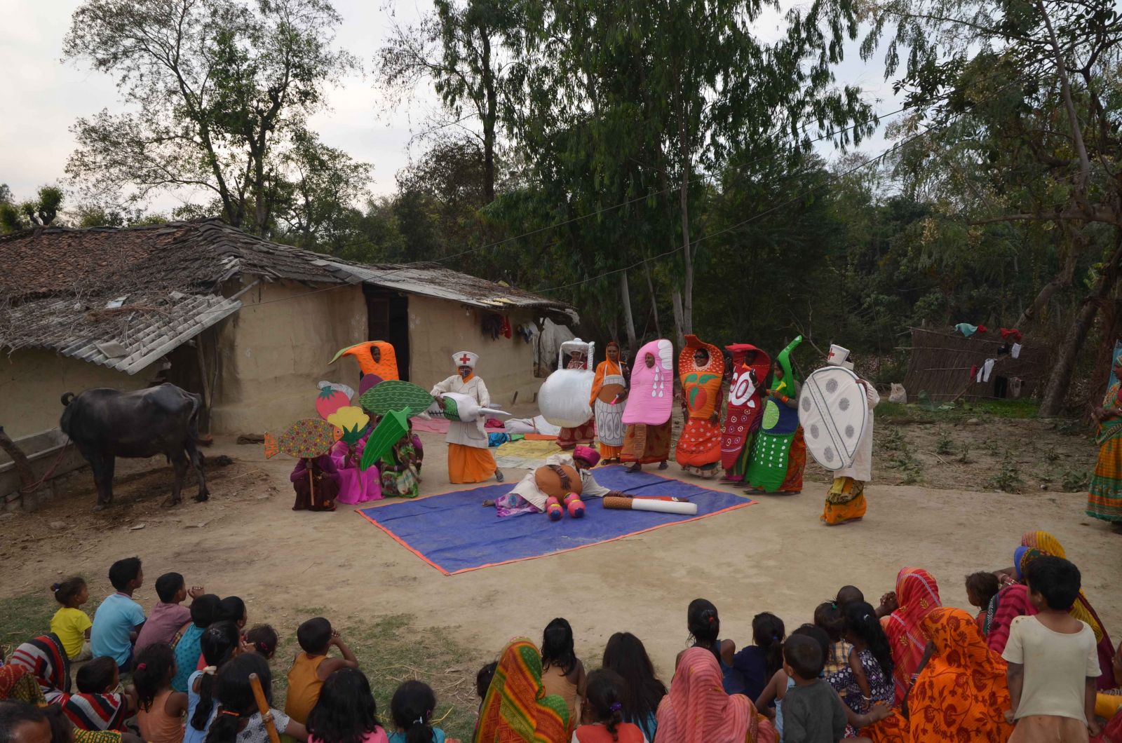 Performing the drama in 16 villages requires a bus for travel. It requires a mike and a rickshaw, so that once the performers have arrived, one artist can tour the village, rallying people to come to whatever site is chosen—the courtyard of a house, an empty field, a school yard. Quite quickly, crowds of one or two hundred people gather: old men, women holding babies, youth who capture the drama on their mobile phones. There is laughter, applause, and afterwards, questions. “Is Sprite bad for you?” a woman asks. The artists bow and then pack up their costumes and board the bus for the next village. By the time they have performed for two days at the mela at Baraha Bigha, they are polished and confident. It is nothing now to perform in front of a thousand people.