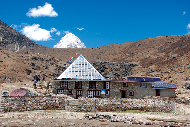 The glass panes were glistening in the morning sun. Outside the wind was beginning to pick up speed; inside it was warm and cozy! State of the art equipment glinted on the worktables before us. The rows and rows of solar panels harvesting the sun could have energized a small community. Power was plentiful and the luxuries of life in the Khumbu like central heating and running hot water were commonplace in ‘The Pyramid’. My good friend, Dr Soni Srivastava had stayed here before and described the place as a five star hotel. Computers, televisions, DVD players, plush furnishings and a high speed satellite link made life ‘king size’. ‘The pyramid’ is a geological research station where research is conducted on weather patterns, glaciers, rocks, snow, ice and sediments, among others. I and my friend, Dr Anip Joshi, were standing in the deck of the pyramid while one of the local employees talked about a science (geology) far removed from our own, in his precise, well modulated voice. We were at around 5000 m. altitude at the outskirts of Lobuche in the Khumbu region of Nepal. The day was warm but would turn chilly the moment the sun slipped behind the clouds.