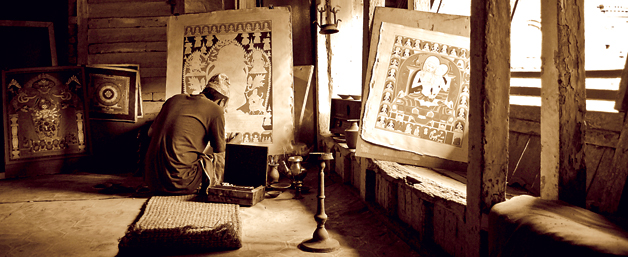 His preparations lay sprawled before him just like he too is sprawled on the floor, eyes gazing at every nook and corner of his piece with a precision akin to that of an eagle. There is no room for error. The tools he uses so gently yet with such tremendous effect are his brushes and paints; brushes and paints that will create an enigma. This is what he wants his art to be. His art shall lure eyes from all around him, and reflect images, colors and stories to the beholder. He niftily changes his brushes in his special box that has three holes especially dedicated to the three deities: Avalokiteshvara (deity of compassion), Vajrapani (deity of power) and Manjushri (deity of wisdom). His brush works as if moving on its own, a stroke here and a stroke there and then a stroke everywhere. The brush and colors move with an unstoppable speed and precision at an instance and then stops suddenly, and again he moves doing the reverse, contradicting the former method by being gentle and subtle with the art. While focused on his art, his mind is also meditating. Chants, doctrines, even simple words and minute suggestions recollected from his master’s teachings preoccupy his mind. He places an image of Manjushree in front of him and visualizes it dissolving into himself; he is now infinite in wisdom. The artist is also at one with his tools; visualizing the image that he is about to paint and the image itself dissipates into his instruments. The artist’s mind wanders around the suffering of different beings in different worlds and this masterpiece will benefit those who are suffering. His thanka is ready.