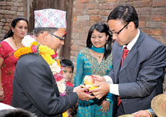 Mostly elaborate shaguns are offered during wedding rituals. The family of the groom sends expensive sweets, spices, jewelries and garments to propose to the bride. And as a sign of approval the bride’s family responds by offering equally extravagant shaguns in return. It is assumed that the better the shagun, the more prosperous the family. Religiously, Tihar, the festival of lights, is the ultimate bash for offering shagun. The five day festival begins with feeding special food to crows, dogs and cows respectively for the first three days - as a sign of respect. On the day of Laxmi Puja, on which Godess Laxmi, the Hindu goddess of wealth is paid homage, houses are decorated with lights, and offerings of food and money are made to children who go around the neighborhood, singing hymns and merrymaking. The last day of the festival ends with Bhai tika or brother’s day. Sisters offer an assortment of delicacies, spices, sweets, fruits, garments and put seven colors of Tika on their brothers’ forehead. The ritual, with such shagun, is believed to elongate their brothers’ lives. Legend has the story of a sister who saved her brother from Yama, the god of death. Animal sacrifices are also considered a shagun. This is mostly carried out during Dasain and Kul puja, a certain ritual performed once a year to remember all the deceased members of one’s family. Increasingly fruits such as coconut and sugarcane are replacing animal sacrifices, especially during inaugural ceremonies of different projects.