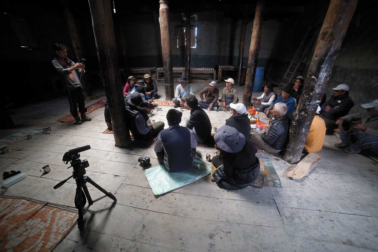 Fuzzscape (and no, I don’t know why it’s called that, either) was conceived by Prasiit Sthapit, a photographer and filmmaker, Rajan Shrestha, a songwriter and music producer, and Rohit Shakya, also a music producer in addition to being a director. The idea behind what they do is simple but effective: the trio travel to different parts of the country, interacting with local people and listening to their music. Their stay culminates in a song being written—in collaboration and often performed with these same local musicians. They’ve produced a ten-minute short about each location they’ve visited, a list that so far includes Banepa, Shermathang in Helambu, Birgunj, Bhojpur, Janakpur, and Manang. Listening to them speak, I was impressed by their sincerity and desire to get out of their comfort zone, as well as their respect for and humility in learning from the local and traditional musicians; this all came through really clearly, making their experience something that transcends the ‘guys from the big city visit a village’ trope that it could otherwise have become. “We are not saviors of intangible heritage, we’re just musicians who are interested in making music,”they said.