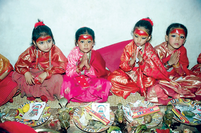 Over the past month, you may have seen girls as young as six or seven, dressed up as brides, at different places in the Kathmandu valley. The children were beautiful in red saris and glittering “jewelry” and the hair and make-up made sure these young “brides” to be felt they are the center of everyone’s attention. The young girls were about to enter into their first of three marriage ceremonies. Locally the ritual is called the bel bibaha (marriage to the bel fruit). The bel fruit is a symbol and represents her first “immortal” husband. Each year the tree blossoms and bears fruit, the “husband” is well.