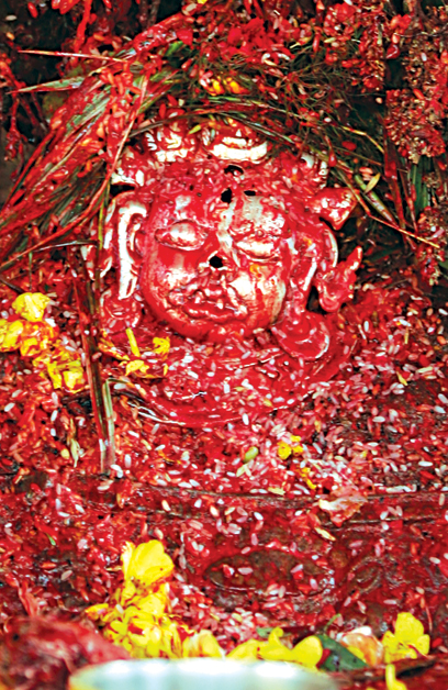 At the old palace of Hanumandhoka we have the giant statue of Kal Bhairab (Kal means death). History tells us that when King Pratap Malla was building a conduit to bring water from Budhanilkantha to Hanumandhoka, the workers dug up this huge and beautifully crafted Licchavi period statue. The statue and the rituals of the Bhairab are of great significance to Nepalis because it is Kal Bhairab that prevented corruption for many centuries. Each year civil servant jobs, positions and authorities had to be renewed by the rulers in a ceremony called Pajani. The oath taking that followed the appointment took place in front of Kal Bhairab and each swore to the deity that if they lied, cheated, or stole, they were prepared to die a violent death at the hands of Bhairab. This is why the Kal Bhairab is also referred to as the Adalat (court) Bhairab. At the Pashupati temple, the priests were required to take the oath in front of the Unmatta Bhairab whose statue is located in the same complex.