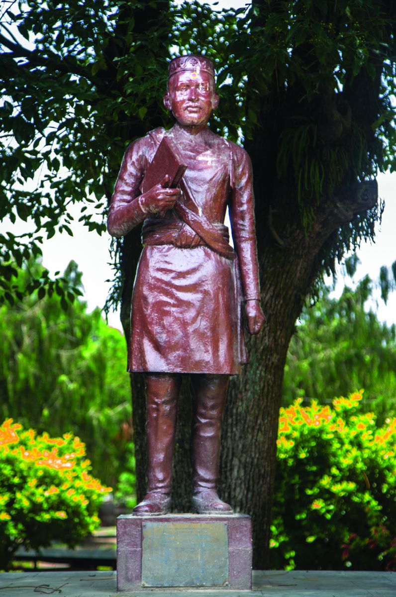 The bust of a mustachioed gentleman wearing the traditional labeda with a sash over the right shoulder and a black rounded topi, holding a book in his right hand, is a familiar image seen at crossroads, parks and mostly at schools. This image is of Adikavi Bhanubhakta Acharya, the first poet in the Nepali language, the language that we speak today. Previously, literary works of prose and poetry were written mostly in Sanskrit, a language limited to the Brahmin class. He thus contributed to develop the Nepali language and literature, which at that time was constrained to the oral medium. The title of Adikavi or ‘the first poet’ was given to Bhanhubhakta by Moti Ram Bhatt in the 1890s while writing his biography. Moti Ram Bhatta was another very famous poet after the times of Bhanubhakta, and the person who actually published the works of Bhanubhakta, posthumously, popularizing his life and writing. The title of Adikavi was later officially approved by Prime Minister Juddha Shumsher. In late 1960s Bhanubhakta was declared a National Icon, or Rashtiya Bibhuti, by the Nepali Government and a stamp was published with his iconic pose in 1962. Information about him was included in school text books from then on and students read his poems and prose. A second stamp was issued for his bi-centenary birth celebration in 2013. In 2015, a silver coin of NRs 2,000/- denomination was put out to commemorate him and his contribution to Nepali culture.