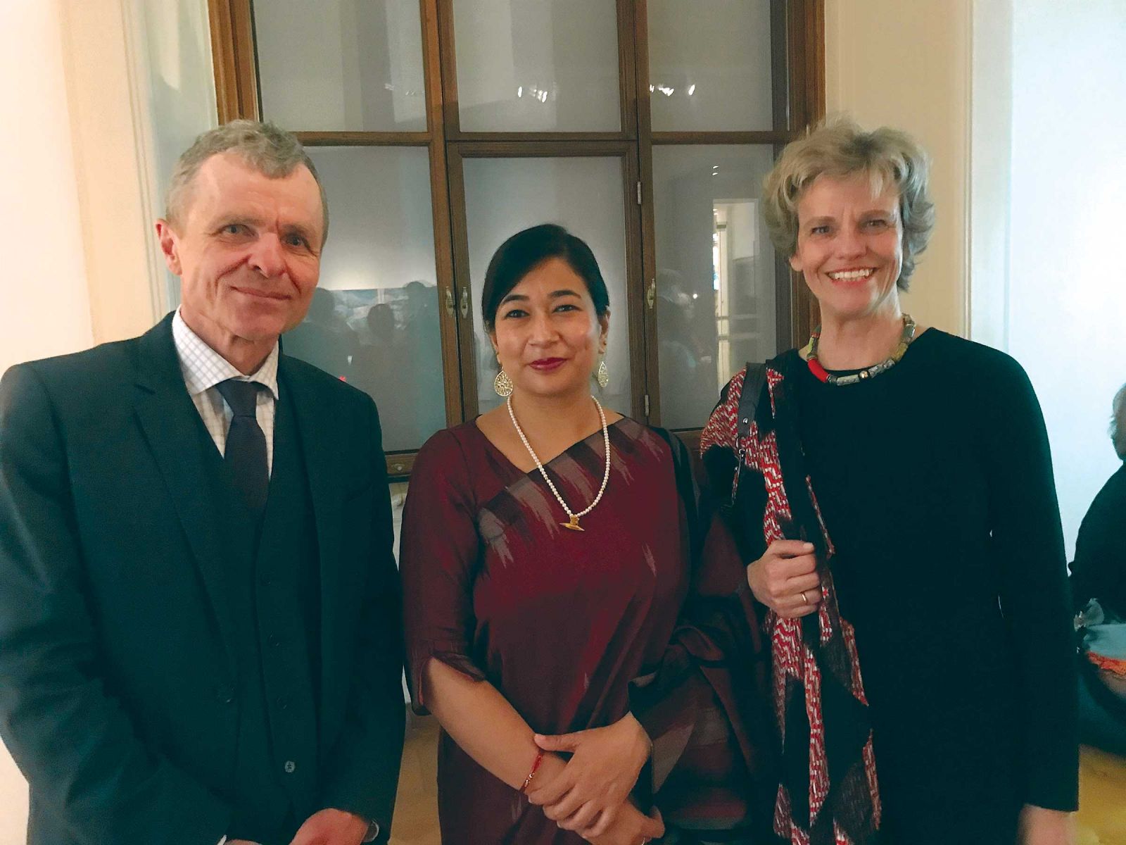 Friends and promoters of Nepalese art filled the lobby, everyone discussing the spectacular show. On the evening of April 12, artist Ashmina Ranjit gave a talk and presentation to visitors. Questions about her installation were put forward, and she shared her explanations in the most gracious way, easily understood by the audience. Seven more artists will be visiting at different times throughout the period of the exhibition to give talks and presentations, to keep the exhibition engaging for visitors. The travel of these seven artists is sponsored by Nepal Investment Bank.