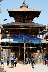 During the period in Nepali history when the Malla rulers of the valley were going out of the way to build bigger and more beautiful palaces and temples, it seems not just kings and artists were busy. Spies and secret agents were also in great demand. They specialized in innovative ways to out wit the agents of the other city kingdoms. There is a story related to the three stone pillars at the Patan Durbar Square. One carries the gilded statue of Yognarendra Malla paying homage to the Teledega dated 1694 AD. The other two are in front of the Krishna Mandir and Bhimsen temple just a few meters away. As the story goes, the three pillars were actually one tall pillar and was so magnificent it was the talk of the kingdom. Something had to be done about it; and so an agent was hired whose sole job was to go to Patan each day and put his ears to the stone pillar, tap it with his knuckles and listen carefully.