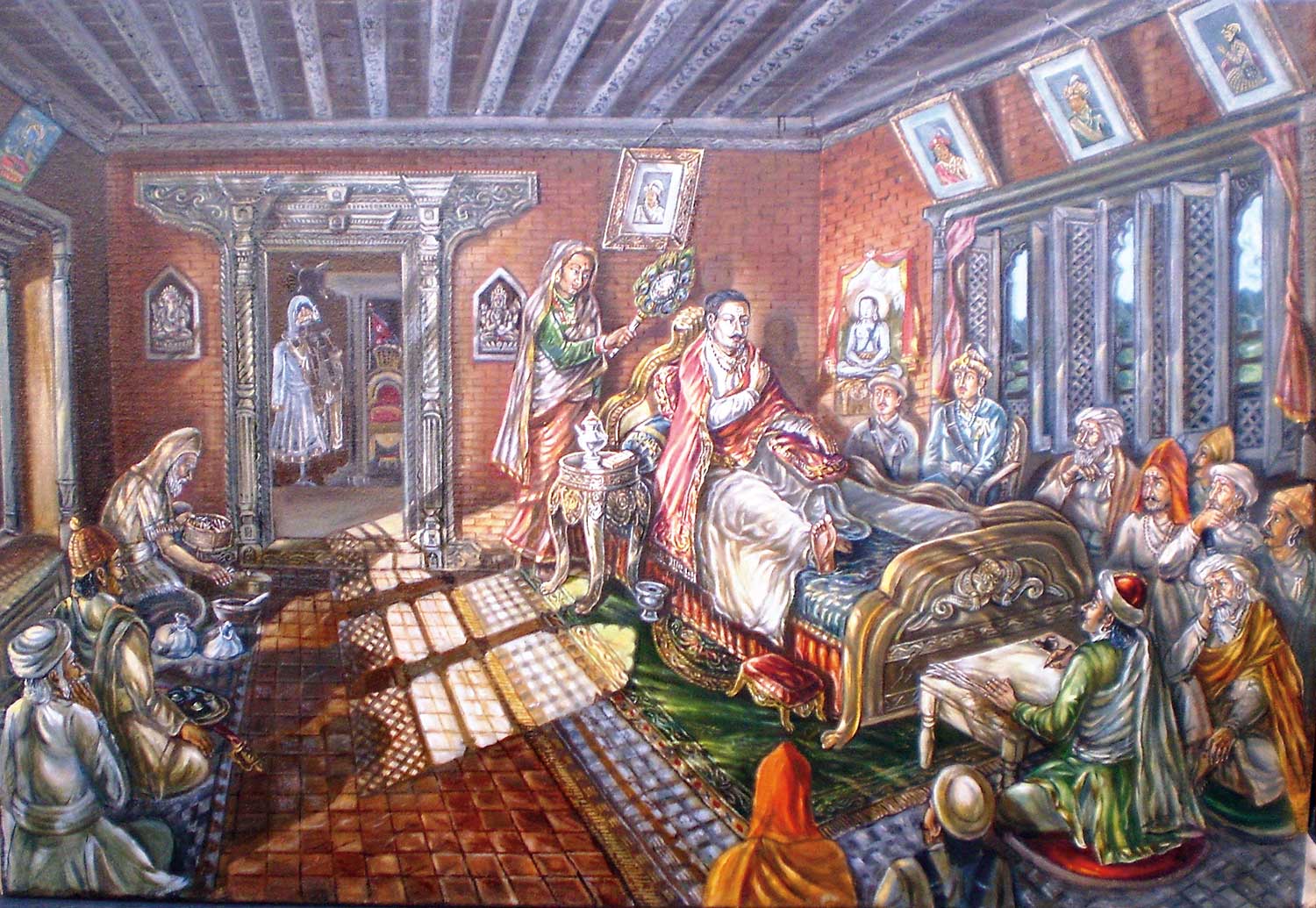 When we look deeper into the paintings of Sharma, what we notice are symmetrical, yet complex compositions. Symmetrical because it is easy to divide the compositions into mostly vertical halves and complex because the artist takes special care not to omit any props that are required to complete the historical context. For example in the painting of the Dibya Upadesh of Prithivi Narayan Shah, when the king is advising his courtiers about polity, small details in the interior of the palace are carefully thought of; the play of light and shade, the props and people that surround the king, including the view of the hills outside the window, dramatize the event, which in fact is a very significant one in our history.