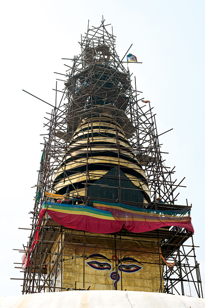 Visitors to the iconic hilltop Buddhist temple of Swayambhunath will soon discover that all that glitters is indeed gold. The gilded spire of the temple, visible from lower lying areas of the valley, has been encased in scaffolding for the last two years as workers were engaged in replacing the gold plating and carrying out various other restoration works.