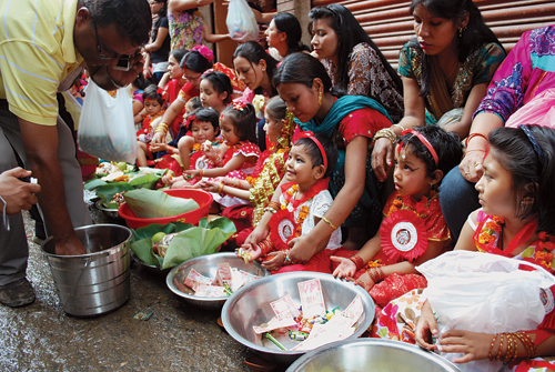 Weeks before the Kumari Puja of Balkumari takes place, people jostle to get tickets to the event so that the pre-adolescent girls in their family can participate in the rite. Organizers allocate high priority to girls who have a tendency to fall sick frequently, as it is believed that partaking in this Puja earns divine merit that will keep them healthy. To earn a place in the ceremony, the only criterion is that a family must contribute a food item (grains, fruits, sweets) that is distributed to all other participants. This is a good example of how ancient religious and social practices have been designed such that gain is possible only by giving.
