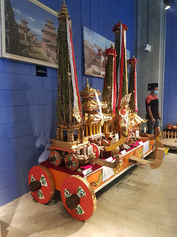 During this World Expo, Nepal is bringing its tangible and intangible cultural heritage to Dubai to share with the world. Many cultural artifacts are also being showcased during the Expo. A gold plated mandala, smaller replicas of chariots pulled in different jatras, paintings and replicas of festivals and deities of Nepal are also being showcased. The original plan for the expo was to build a replica of Kasthamandap in Dubai but the idea was scrapped due to the pandemic. This replica however, has also been created and is being showcased in the Nepal pavilion.