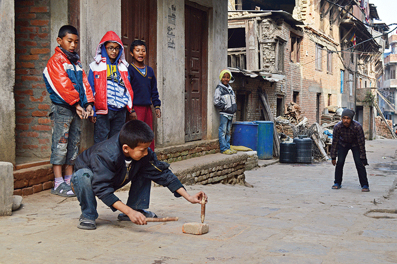Similar to cricket, dandi biyo was very popular with children before modern toys and games took over. Dandi can be a stick or a bat, and biyo is a smaller, six-inch wooden stick, or a ball. A player digs a hole four inches wide and the biyo is kept across the hole. The player launches the biyo and the others try to catch it, and if caught the batter is out. If not, the batter is safe. One of the fielders now tries to get the biyo in the hole, while the batter tries to hit it to score. If you want to learn to play, ask around, particularly amongst the older generation, and you’re sure to find someone who can show you. Let’s keep our traditional games alive!
