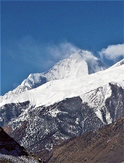 I described Thak as “a high Himalayan valley crammed down between Annapurna and Dhaulagiri. The Kali Gandaki River meanders along the valley floor here at an average elevation of 8500 feet, while peaks soar overhead up to 18,000 feet higher.” Dhaulagiri, at 26,795 ft. (8,167 m.), is the most impressive. Its domineering presence towers over Thak Khola on the way north to Tukche, Marpha, and Jomosom.
