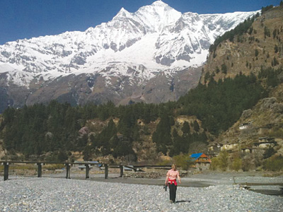 I clearly heard a voice, my voice, recently while crossing the remarkable Kobang Bridge in Thak Khola. It’s not your typical suspension bridge, but a long elevated track that requires walking cautiously for a long ways on three parallel beams 12 feet off the ground, or above the water. Each log is about eight inches wide, squared, and insecurely laid side by side from one T-shaped concrete pylon to the next. We crossed close to 20 sections, each roughly 24 feet long. There were no handrails, and we soon discovered that some of the beams wobbled precariously under foot.