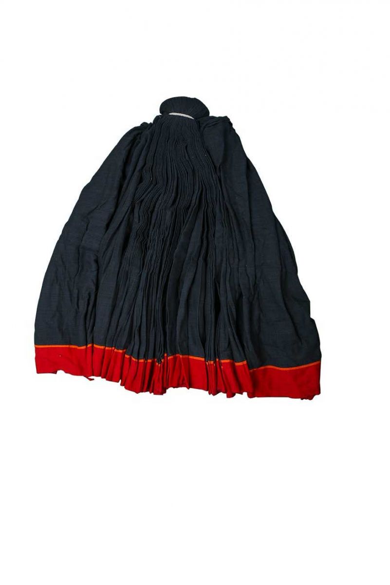 Worn by Newari women in and around Kathmandu Valley, the haku patasi is a black sari with red borders. Made of local handmade cloth, it is usually heavier than the regular sari. A long white piece of cloth called a patuki is wrapped around the waist when wearing this attire. A chaubandi cholo, a full-sleeved blouse tied at four ends, is worn as the top, and above it is worn a shawl (haku gacha).
