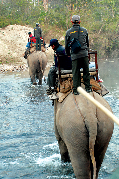 Our elephant soon separated from the rest of the other elephants, and our guide started to look out for the various wildlife species. We saw crocodiles when we crossed the tributaries of the Karnali River, then various deer, many species of birds, and were hot on the heels of an elusive Royal Bengal Tiger. Our guide told us that the tiger paw prints we were tracking were fresh, probably made earlier that morning. Our luck ran out, however, as we lost track of the prints. The big cat continued to elude us.