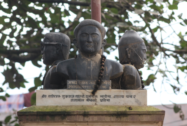 At 10:45, I’m ready to move once more; it begins to drizzle again as I bid goodbye to Hari. I follow the pitched road that later turns into a concrete road and it’s very steep making me take careful, smaller steps. But the first settlement I reach is not Panga. This is Itagol I am told, and I turn right at the end. Further on I finally reach a four way crossing from where Panga begins. You can walk from Chovar to Panga in less than 30 minutes. The main road is actually a parallel road on the right which meets this smaller road at the next crossing. Next to the large pipal tree at the crossing are the busts of the three famous martyrs who were executed by the Rana regime.