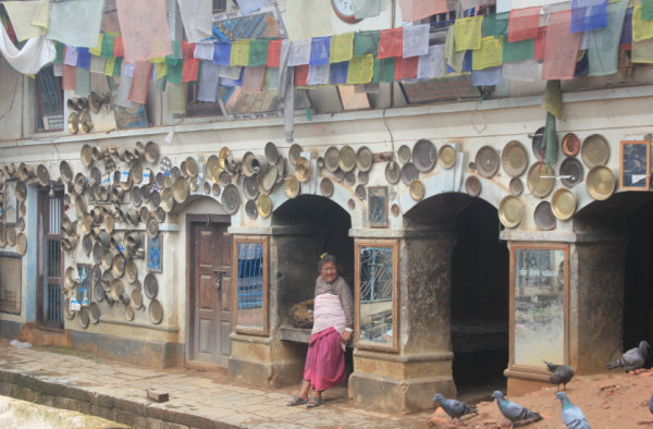 Nearby is a white chaitya and turning right from the pati you can see the old Aadinath shrine. There are some old Newar folks at the pati playing the ancient game called pasa. The inside walls of the rectangular building surrounding the shrine has metal plates nailed onto them. The belief goes like this: if you give up something that you use every day and is valuable to you, you gain merit by handing it over to the shrine as a kind of sacrifice. The shrine itself was partly damaged by the earthquake of 2015. A large colorful prayer wheel can be seen in one corner and many small ones that have seen better days, around the shrine.